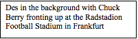 The next time I met Chuck was on a hot sunny day in Frankfurt, 22nd July 1973. Fumble were on the same bill as Chuck Berry at an open air concert at the Radstadion Football Stadium. Chuck had been performing the previous night at the Buxton Rock Festival in Derbyshire, and his backing band had missed the flight to Germany, so Chuck was topping the bill, and had no band. With just 30 minutes notice, and no time for preparation we were asked if we would step in for Chuck’s missing band. “Great !” we thought, “this is one for the scrapbook” For Fumble to accompany Chuck Berry live on stage performing his classic songs was on it’s own not a problem, but we had no idea which songs Chuck intended to play, and it would have been comforting to at least know that. So with half an hour to go, and 20,000 noisy expectant fans in the stadium, I fought my way to Chuck’s changing room, only to find him pulling on a pair of dazzling red check trousers. After introducing myself and briefly saying how much we liked his music, I asked him what numbers we would be playing, to which he politely but firmly answered “I’m changing my trousers”. I asked the same question, slightly differently, and drew the same response. Chuck was busy, so I took the hint and made myself scarce! I went back to the Fumble band members, who were eager for some news. I told them about the trousers, and that we were still no wiser about which songs we were going to play. I asked one of Chuck’s aids for some guidance about the set to which he said “Just watch Chuck’s left leg – when he wants you to pause – he’ll lift it off the ground and stamp, you break when he stamps !”.